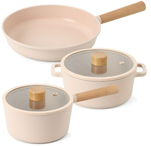 세트의 구성품은 18cm 편수냄비, 20cm 양수냄비, 24cm 후라이팬으로 다양한 요리에 활용할 수 있습니다.