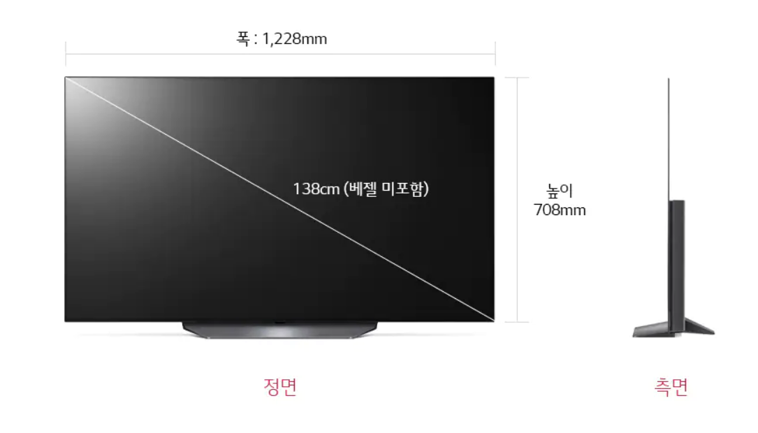 크기는 가로 1228mm x 세로 708mm(744mm) x 깊이 47mm(246mm)이고 소비전력은 335W입니다2. 에너지효율은 4등급이며, 스탠드와 사운드바(SR-C20A)가 함께 제공됩니다.